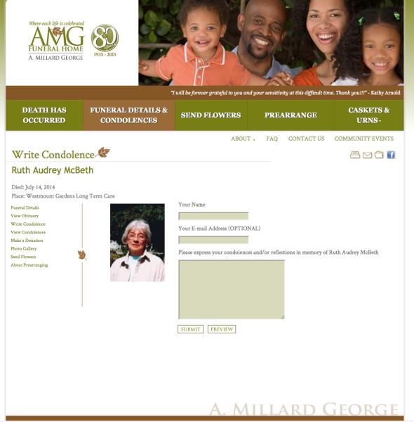 Cremation has taken place. Family will receive friends one hour prior to the memorial service at the A. Millard George Funeral Home, 60 Ridout Street South, London on Tuesday June 10, 2014 at 3 p.m. with Reverend Jim McGee officiating. Interment in Glendale Memorial Gardens in Etobicoke Wednesday, June 11, 2014. As an expression of sympathy, donations may be made to the Alzheimer Society London and Middlesex, 435 Windermere Road, London, ON N5X 2T1 or the charity of your choice. Online condolences, memories and photographs shared at www.amgfh.com